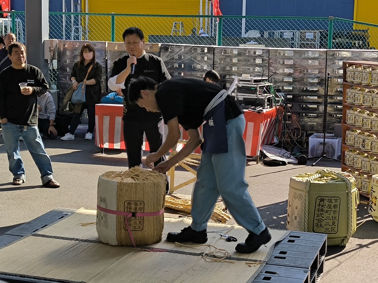 ステージでは菰巻きの実演中。