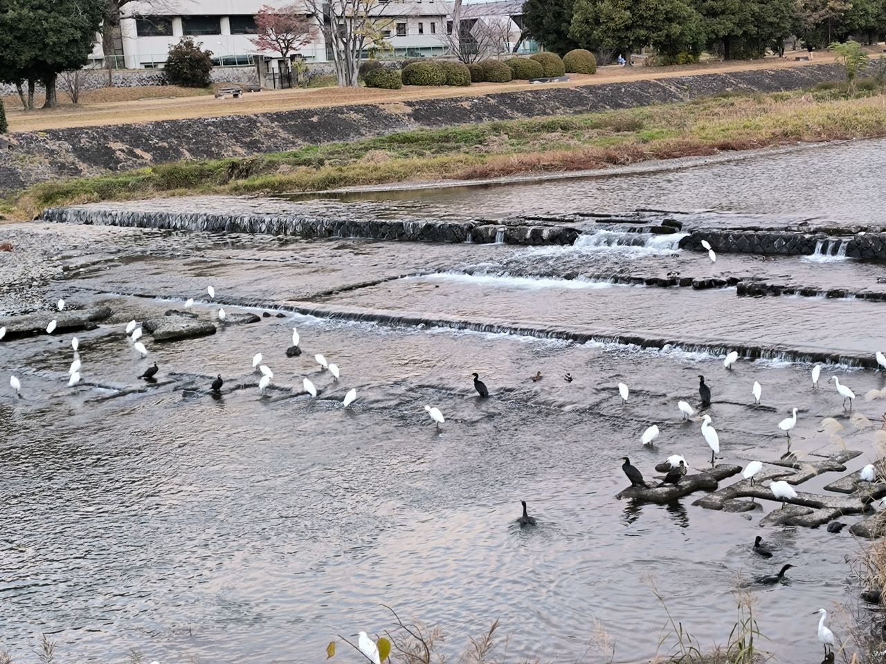 鴨川には白、黒、茶の鳥